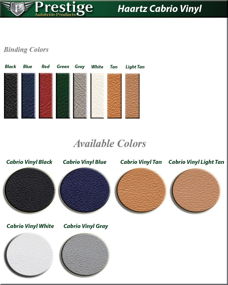 Manufactured by the Haartz Corporation. Cabrio Vinyl is the Factory Original material for Mazda Miata NA and VW Rabbit car hoods and features the original cabrio grain PVC facing and durable cotton backing.