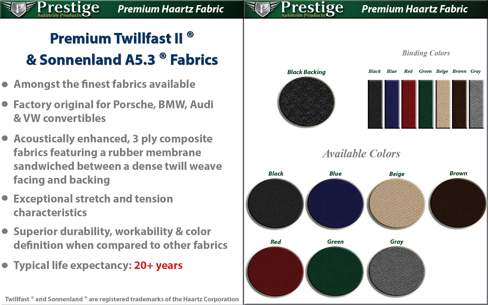 Twillfast ® and Sonnenland ® are registered trademarks of the Haartz Corporation - Cabriotex ® is a registered trademark of Prestige Hoods